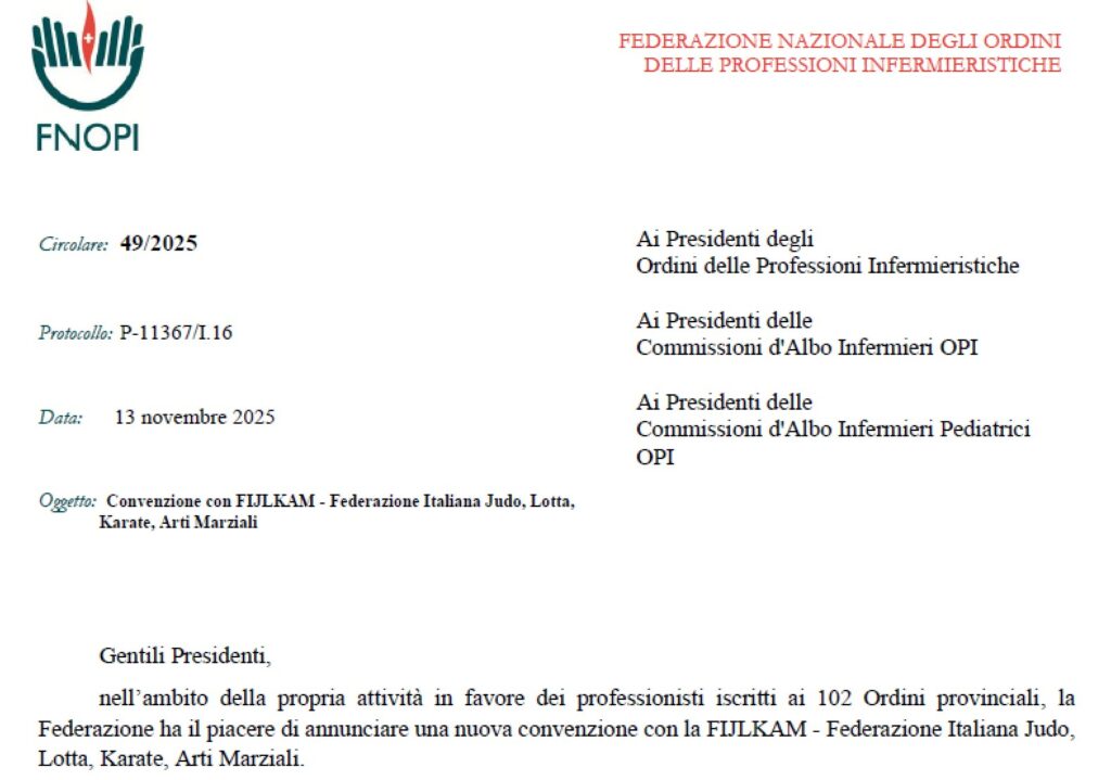 La FNOPI ha il piacere di annunciare una nuova convenzione con la FIJLKAM – Federazione Italiana Judo, Lotta, Karate, Arti Marziali. Con il suddetto accordo si instaura un rapporto di collaborazione con l’obiettivo di aprire nuove prospettive per la formazione e il benessere psicofisico degli infermieri e degli infermieri pediatrici. L’accordo si fonda sulla comune volontà di favorire la cultura del benessere e della consapevolezza personale all’interno della comunità infermieristica attraverso la cura del proprio corpo e identificando nello strumento della formazione e dell’esercizio fisico il veicolo principale per la cura di sé e dello sviluppo professionale.